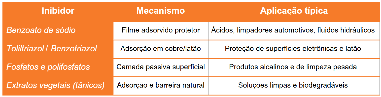 Fosfatos e Polifosfatos: Inibidores de corrosão que formam uma camada passiva superficial inorgânica no metal, commonly utilizados em detergentes alcalinos e ácidos industriais.